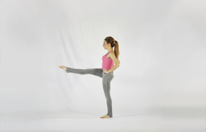 - Seconda propedeutica dell’Utthita Hasta Padangustasana con ginocchio piegato: La parola d’ordine di questa posizione è sinergia. Se mente e corpo non collaborano, i risultati possono essere davvero sgraziati. Partendo con i piedi uniti, la mano sinistra va al fianco sinistro, la gamba destra viene portata su al petto piegata, con la mano destra ben salda alla tibia destra, proprio sotto il ginocchio. Qui il braccio è forte, la spalla salda nel sostenere il peso della gamba. L’addome è forte e attivo, quindi il busto è eretto. Nell’inspirazione ci si prepara e espirando si apre lateralmente l’anca. Agli inizi lo sguardo rimane vigile di fronte a noi, con la fortificazione muscolare e la presa di confidenza con la posizione, è possibile ruotare la testa nella direzione opposta alla gamba. Anche questa posizione viene tenuta per 5 respiri.
